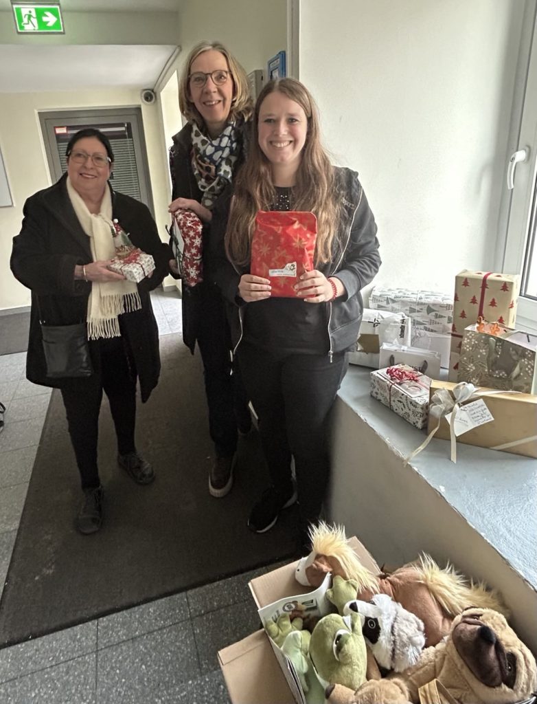 Rechtzeitig vor der Weihnachtsfeier haben unsere Clubschwestern Maegie und Karin die Präsente für das Frauenhaus in Herten an Sozialpädagogin Julia Rosenkranz (r.) übergeben. Wir unterstützen die Frauenhäuser in Herten und Gelsenkirchen seit vielen Jahren nicht nur mit Geld- und Sachspenden. Zu Weihnachten erfüllen wir den Bewohnerinnen individuelle Wünsche – Geschenke wie etwa eine Handtasche, ein Parfum oder einen Föhn. Julia Rosenkranz teilte uns heute mit: „Die Frauen haben sich sehr gefreut, und die Weihnachtsfeier war sehr schön.“