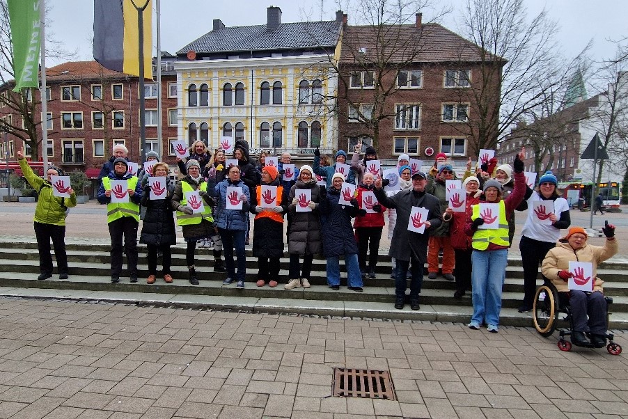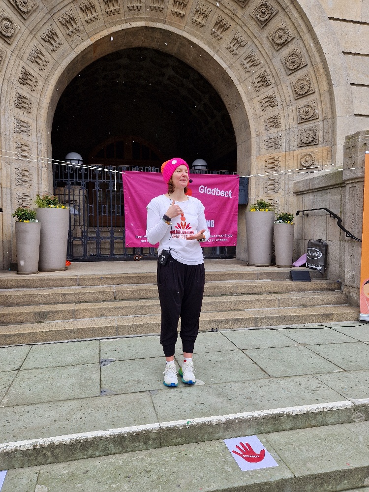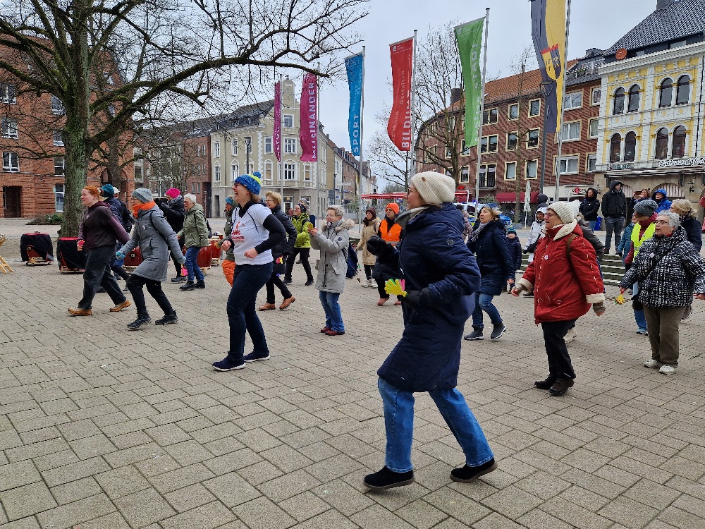 Dass wir bei echtem Winterwetter trotzdem heiße Rhythmen verbreiteten und eine starke Performance hinlegten, verdanken wir vor allem Stefanie Seggewiss. Die Fitnesstrainerin war extra aus Bocholt angereist und heizte uns als Vortänzerin ordentlich ein: motivierend, fröhlich, feurig. Das diesjährige Motto „Women on fire – Ni una menos“ war Programm – sehr zur Freude einiger überraschter Passanten.