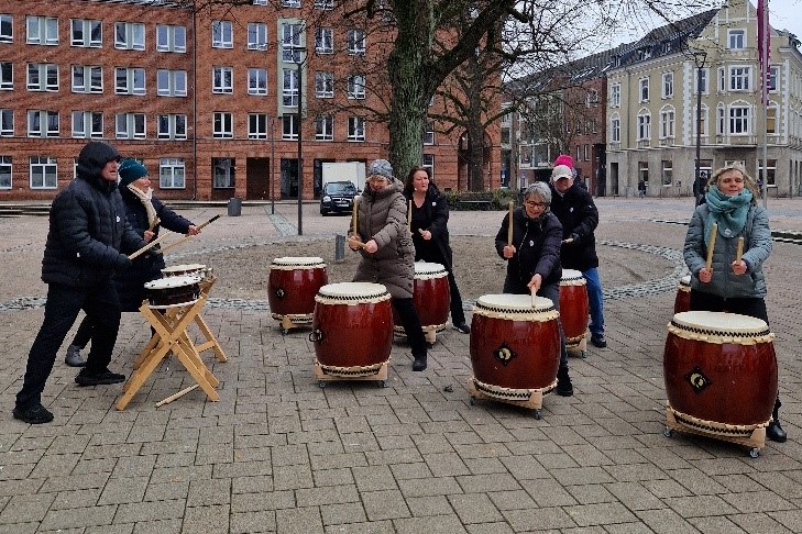 Die Trommeln waren nicht zu überhören: Schon von weitem kündigte die Taiko-Gruppe aus Gladbeck an, dass hier etwas Besonderes passiert. Trotz Schneeregen und kräftigem Wind haben wir am Valentinstag vor dem Rathaus die Kälte einfach weggetanzt – mit einem energiegeladenen Flashmob im Rahmen von „One Billion Rising“. Zum fünften Mal war unser Club bei der weltweiten Aktion dabei.